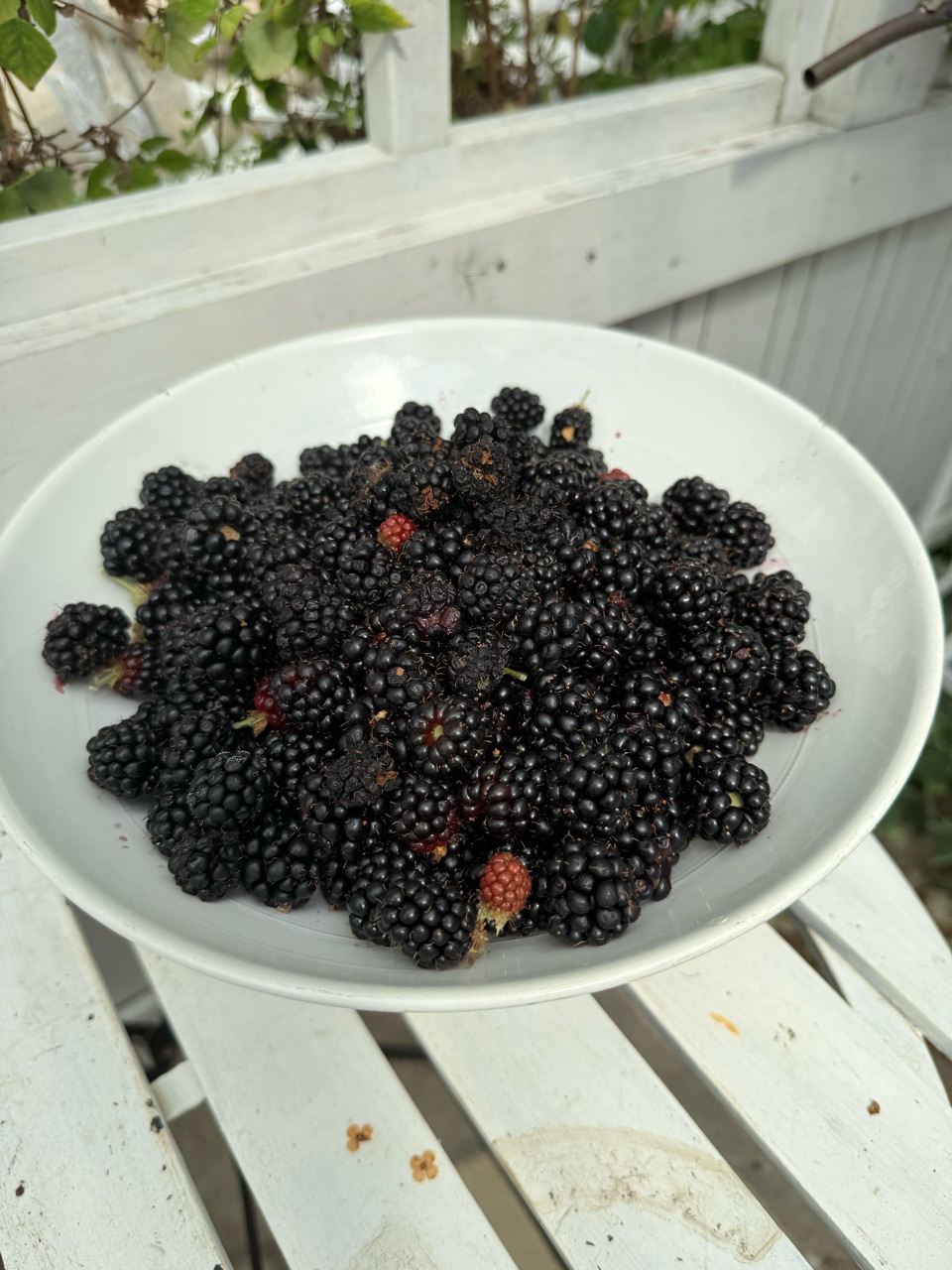 今朝は熟したブラックベリーが沢山あったので虫や鳥に先を越されないように収穫しました(^ν^)